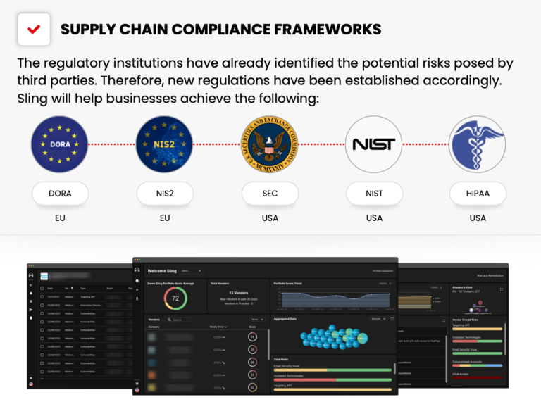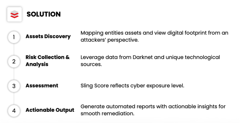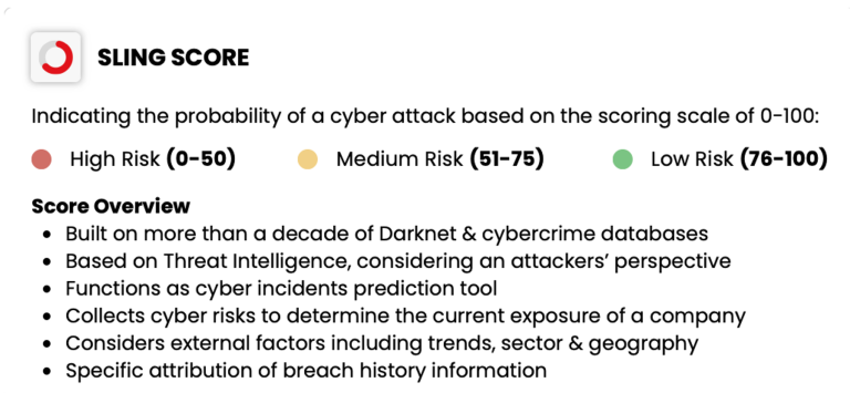 Sling Score tarjoaa markkinoiden kehittyneimmän paketin kolmannen osapuolen kyberriskien seurantaan ja raportointiin (Third Party Risk Management). Moni kilpailija keskittyy pelkästään audit-pohjaiseen ja internetiin näkyvien kolmannen osapuolen assettien haavoittuvuuksiin. Sling Score lisää tähän darkweb-pohjaisen tiedustelun ja mm. tunnusten vuotamisen seurannan.